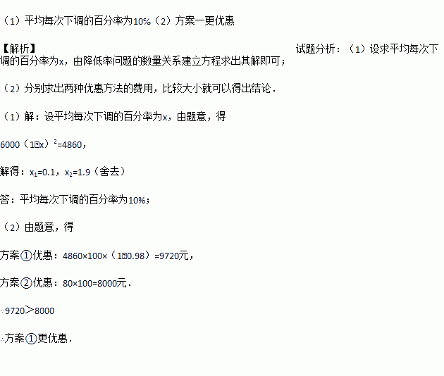 £¨2£©Ä³ÈË×¼±¸ÒÔ¿ªÅ̾ù¼Û¹ºÂòÒ»Ì×100ƽ·½Ã×µÄס·¿£¬¿ª·¢É̸øÓèÒÔÏÂÁ½ÖÖÓŻݷ½°¸ÒÔ¹©Ñ¡Ôñ£º¢Ù´ò9.8ÕÛÏúÊÛ£»¢Ú²»´òÕÛ£¬Ò»´ÎÐÔËÍ×°ÐÞ·Ñÿƽ·½Ã×80Ôª£¬ÊÔÎÊÄÄÖÖ·½°¸¸üÓŻݣ¿