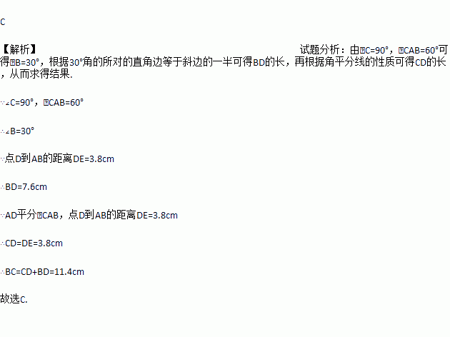 在Rt△ABC中,如图所示,∠C=90°,∠CAB=60°,AD平分∠CAB,点D到AB的距离DE=3.8cm,则BC等于( )