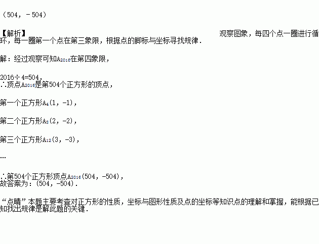 如图,正方形A1A2A3A4,A5A6A7A8,A9A10A11A12,…,(每个正方形从第三象限的顶点开始,按顺时针方向顺序,依次记为A1,A2,A3,A4;A5,A6,A7,A8;A9,A10,A11,A12;…)正方形的中心均在坐标原点O,各边均与x轴或y轴平行,若它们的边长依次是2,4,6,…,则顶点A2016的坐标为_____.