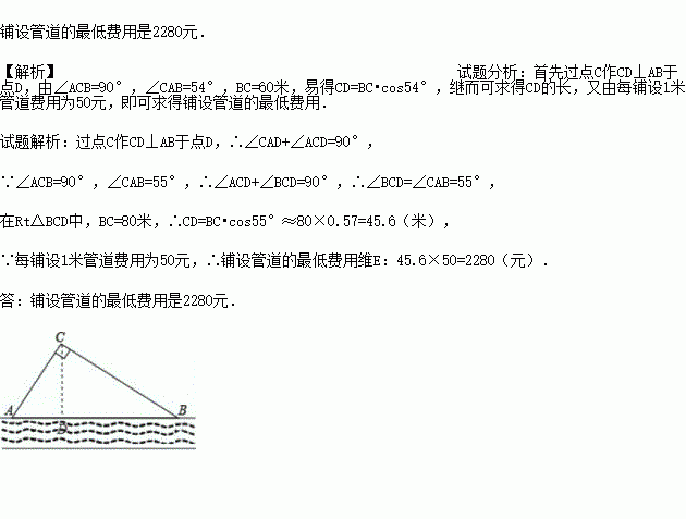 某校生物兴趣小组把一块沿河的三角形废地(如图)开辟为生物园(设AB段河岸为直线),已知∠ACB=90°,∠CAB=55°,BC=80米,学校决定在点C处建一个蓄水池,利用管道从河中取水,已知每铺设1米管道费用为50元,求铺设管道的最低费用(精确到1元).(参考数据:sin55°≈0.82,cos55°≈0.57,tan55°≈1.43)