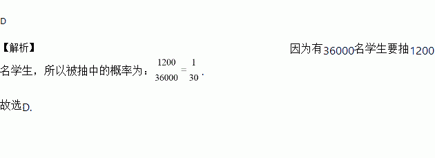 今年我市约有36000名学生参加初中毕业会考,为了了解这36000名学生的数学成绩,准备从中随机抽取1200 名学生的数学成绩进行统计分析,那么你的数学成绩被抽中的概率为 ( )