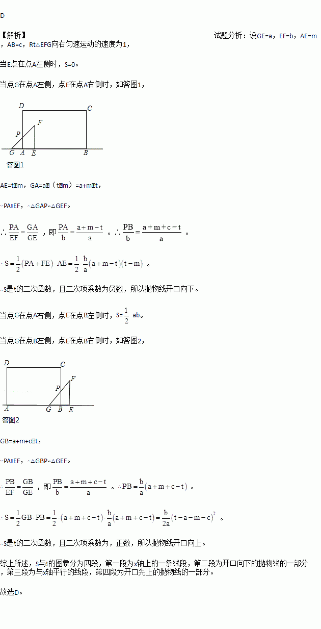 如图,点G、E、A、B在一条直线上,Rt△EFG从如图所示的位置出发,沿直线AB向右匀速运动,当点G与点B重合时停止运动,设△EFG与矩形ABCD重合部分的面积为S,运动时间为t,则S与t的图象大致是( )