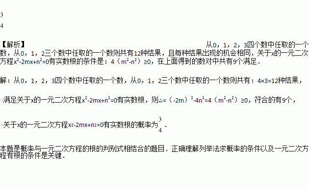 如果m是从0,1,2,3四个数中任取的一个数,n是从0,1,2三个数中任取的一个数,那么关于x的一元二次方程x2-2mx+n2=0有实数根的概率为______.