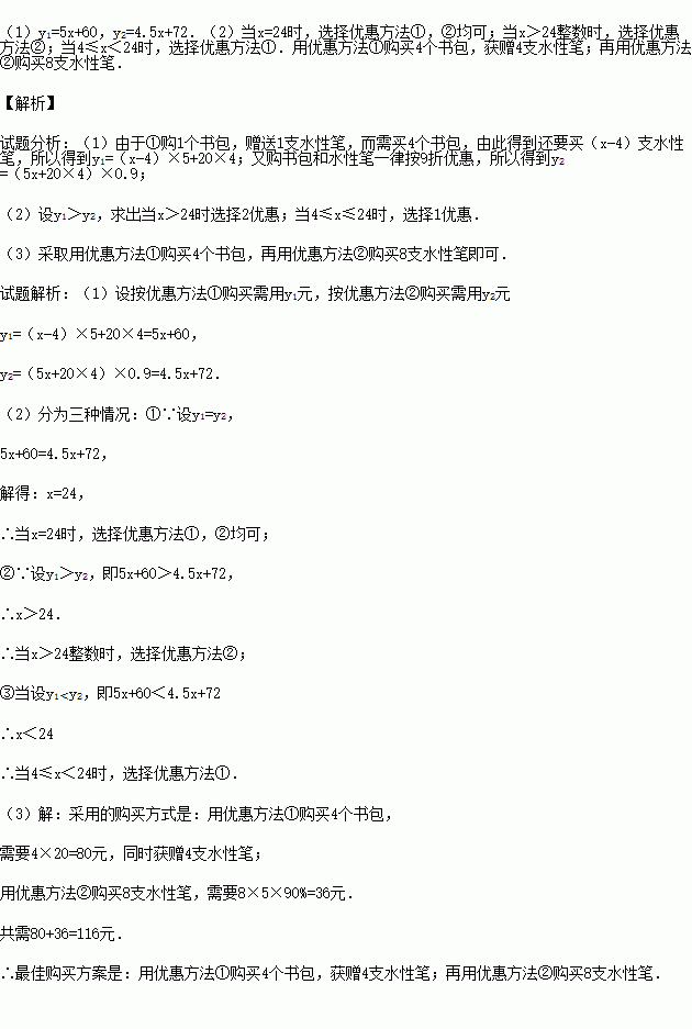 (3)小丽和同学需买这种书包4个和水性笔12支,请你设计怎样购买最经济.