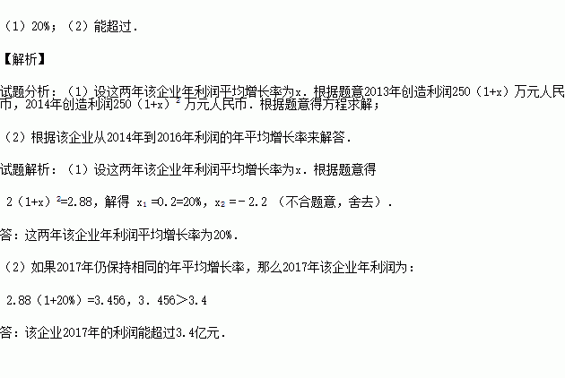 (2)若2017年保持前两年利润的年平均增长率不变,该企业2017年的利润能否超过3.4亿元?