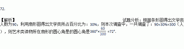 某学校计划购买一批课外读物,为了了解学生对课外读物的需求情况,学校进行了一次“我最喜爱的课外读物”的调查,设置了“文学”、“科普”、“艺术”和“其他”四个类别,规定每人必须并且只能选择其中一类,现从全体学生的调查表中随机抽取了部分学生的调查表进行统计,并把统计结果绘制了如图所示的两幅不完整的统计图,则在扇形统计图中,艺术类读物所在扇形的圆心角是 度.