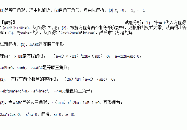 (2)如果方程有两个相等的实数根,试判断△ABC的形状,并说明理由;