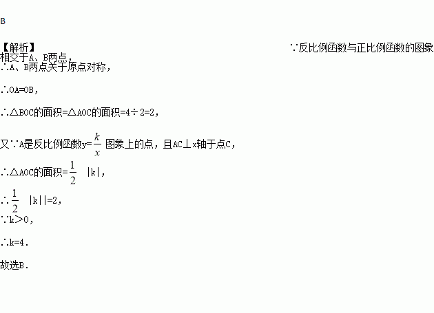 如图,已知经过原点的直线AB与反比例函数y=kx-1(k≠0)图象分别相交于点A和点B,过点A作AC⊥x轴于点C,若△ABC的面积为4,则k的值为( )