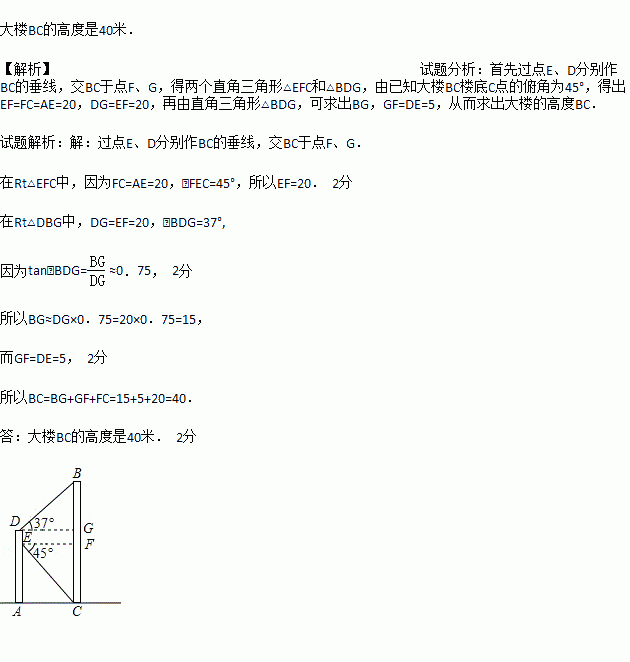 如图,某同学在大楼AD的观光电梯中的E点测得大楼BC楼底C点的俯角为45°,此时该同学距地面高度AE为20米,电梯再上升5米到达D点,此时测得大楼BC楼顶B点的仰角为37°,求大楼的高度BC.