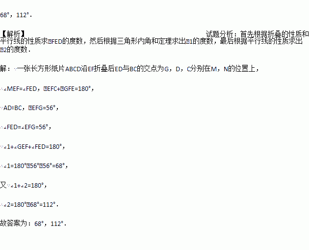 把一张长方形纸片ABCD沿EF折叠后ED与BC的交点为G、D、C分别在M、N的位置上,若∠EFG=55°,则∠1=______°,∠2=_______°.