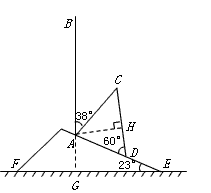 已知山坡的坡角∠AEF=23°,量得树干的倾斜角为∠BAC=38°,大树被折断部分和坡面所成的角∠ADC=60°,AD=4m。