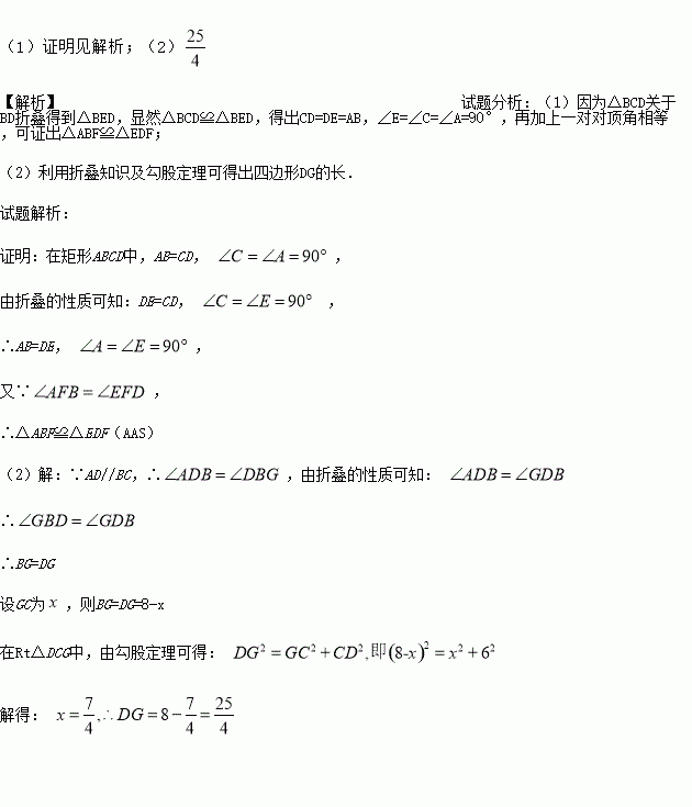 ⑵将折叠的图形恢复原状,点F与BC边上的点G正好重合,连接DG,若AB=6,BC=8,求DG的长.