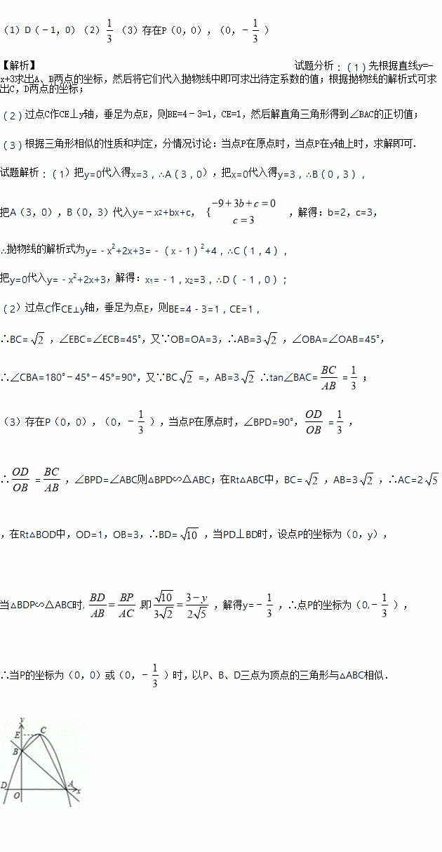 (3)在y轴上是否存在一点P,使得以P、B、D三点为顶点的三角形与△ABC相似?如果存在,请求出点P的坐标;如果不存在,请说明理由.