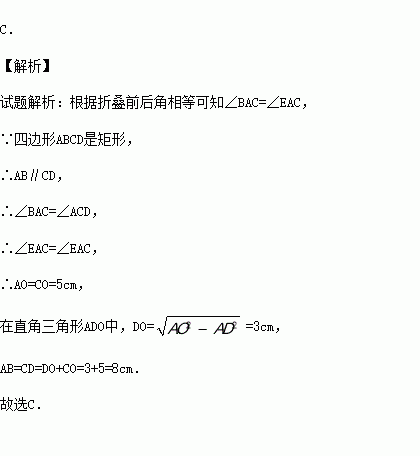 如图,矩形纸片ABCD中,AD=4cm,把纸片沿直线AC折叠,点B落在E处,AE交DC于点O,若AO=5cm,则AB的长为( )