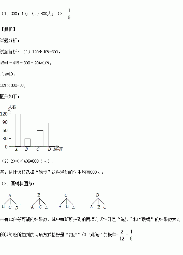 (2)如果该校有学生2000人,请你估计该校选择“跑步”这种活动的学生约有多少人?