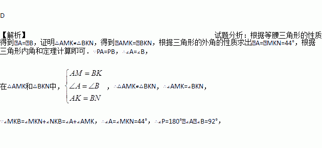 如图,在△PAB中,PA=PB,M,N,K分别是PA,PB,AB上的点,且AM=BK,BN=AK.若∠MKN=44°,则∠P的度数为( )