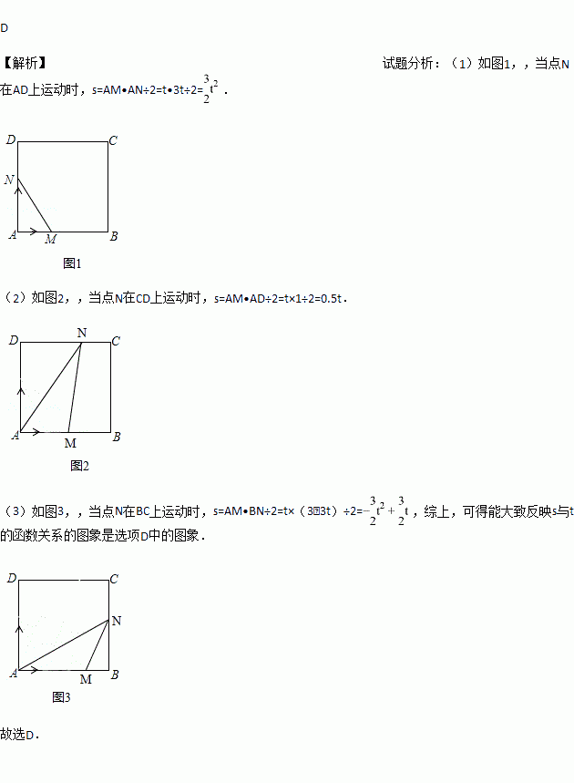 如图,边长为1的正方形ABCD,点M从点A出发以每秒1个单位长度的速度向点B运动,点N从点A出发以每秒3个单位长度的速度沿A→D→C→B的路径向点B运动,当一个点到达点B时,另一个点也随之停止运动,设△AMN的面积为s,运动时间为t秒,则能大致反映s与t的函数关系的图象是( )