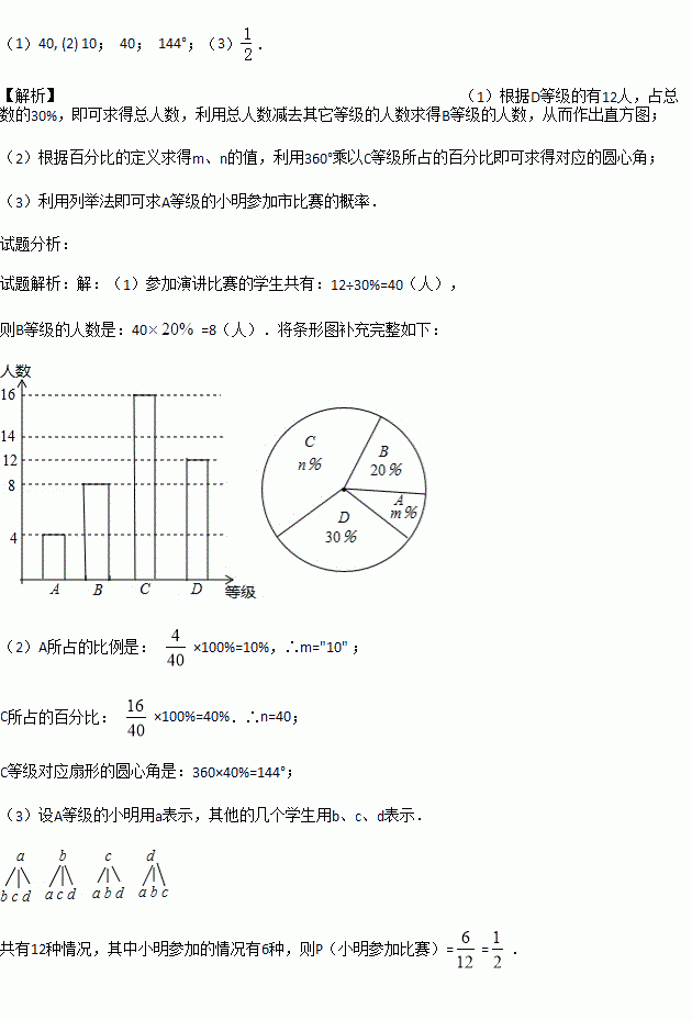 ½ñÄê4Ô£¬ÎÒÊÐijÖÐѧ¾ÙÐÐÁË¡°°®ÎÒÖйú•ÀÊËбÈÈü¡±»î¶¯£¬¸ù¾ÝѧÉúµÄ³É¼¨»®·ÖΪA¡¢B¡¢C¡¢DËĸöµÈ¼¶£¬²¢»æÖÆÁËÈçÏÂÁ½ÖÖ²»ÍêÕûµÄͳ¼ÆÍ¼£®¸ù¾ÝͼÖÐÌṩµÄÐÅÏ¢£¬»Ø´ðÏÂÁÐÎÊÌ⣺
