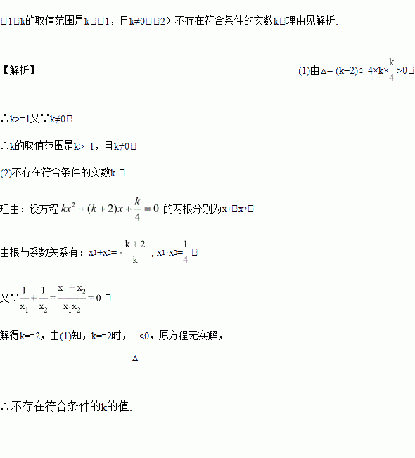 (2)是否存在实数k,使方程的两个实数根的倒数和等于0?若存在,求出k的值;若不存在,请说明理由.