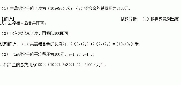 (2)若1m铝合金的平均费用为100元,求当x=1.2,y=1.5时,铝合金的总费用为多少元?