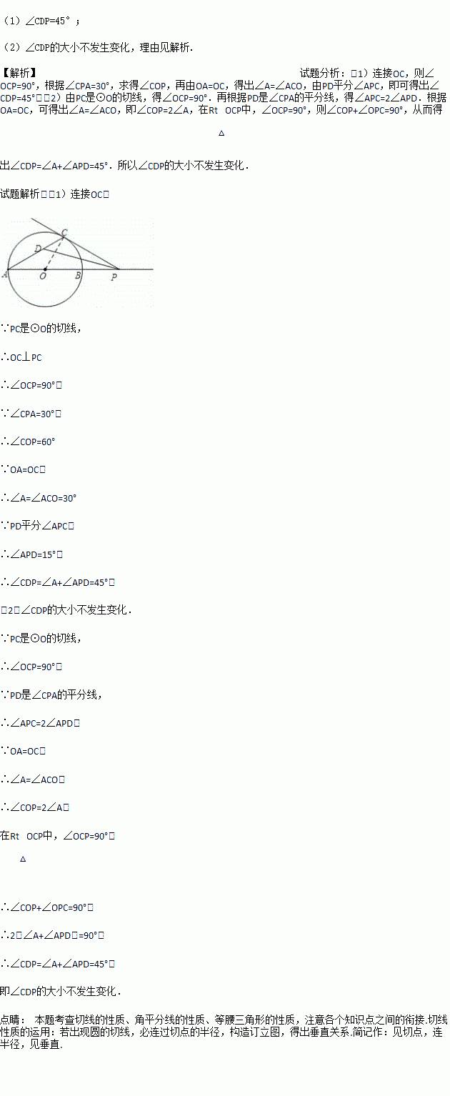 (1)如图1,若∠CPA恰好等于30°,求∠CDP的度数;