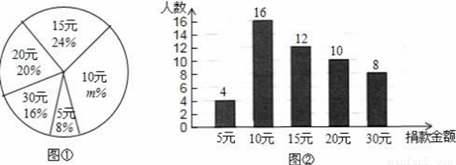 四川雅安发生地震后,某校学生会向全校1900名学生发起了“心系雅安”捐款活动,为了解捐款情况,学生会随机调查了部分学生的捐款金额,并用得到的数据绘制了如下统计图①和图②,请根据相关信息,解答下列是问题: