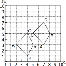 解:(1)如图所示,四边形A1B1C1D1即为所求作的图形;点A1、B1、C1、D1的坐标分别为:A1(7,3),B1(8,5),C1(7,7),D1(5,5);