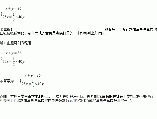 用白铁皮做罐头盒,每张铁皮可制盒身25个,或制盒底40个,一个盒身可以和两个盒底可制成一个罐头盒。现有36张白铁皮,设用x张制盒身,y张制盒底,恰好配套制成罐头盒,根据题意,可列方程组_________________。
