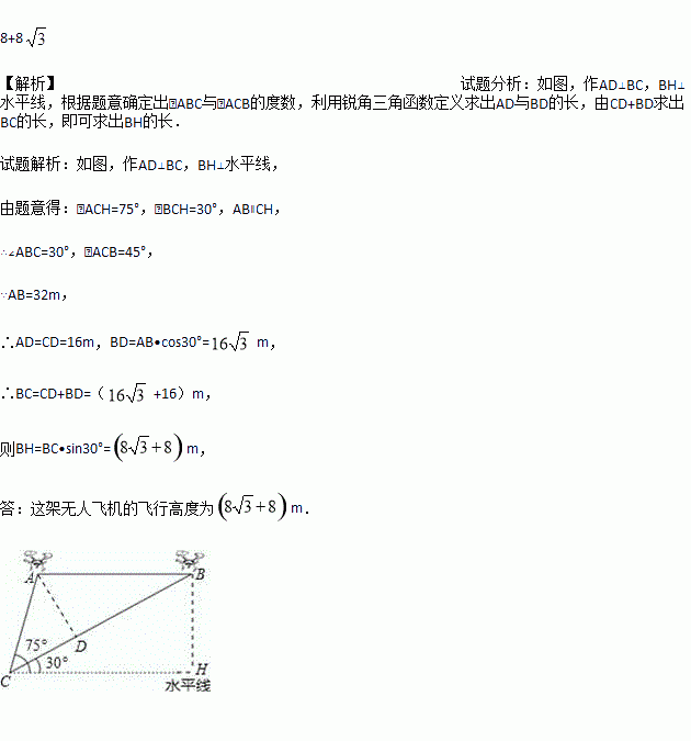 某兴趣小组借助无人飞机航拍校园.如图,无人飞机从A处水平飞行至B处需8秒,在地面C处同一方向上分别测得A处的仰角为75°,B处的仰角为30°.已知无人飞机的飞行速度为4米/秒,求这架无人飞机的飞行高度.(结果保留根号)