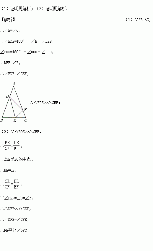 如图,在△ABC中,AB=AC,点E在边BC上移动(点E不与点B,C重合),满足∠DEF=∠B,且点D、F分别在边AB、AC上.