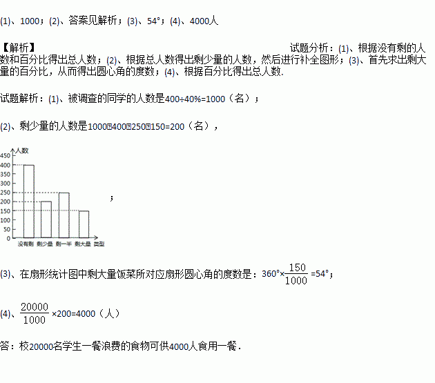 (4)校学生会通过数据分析,估计这次被调查的所有学生一餐浪费的食物可以供200人用一餐.据此估算,该校20000名学生一餐浪费的食物可供多少人食用一餐?
