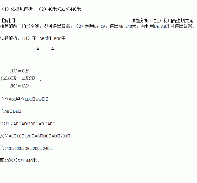 (2)如果小川恰好未带测量工具,但是知道A和假山D、雕塑C分别相距200米、120米,你能帮助他确定AB的长度范围吗?