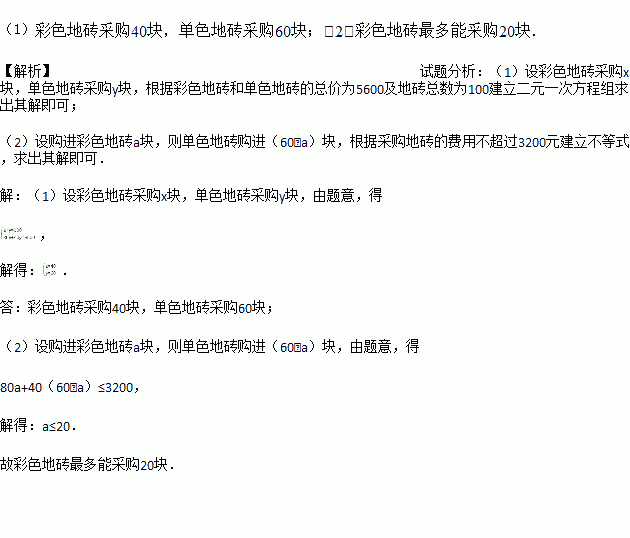 (2)如果厨房也要铺设这两种型号的地砖共60块,且采购地砖的费用不超过3200元,那么彩色地砖最多能采购多少块?