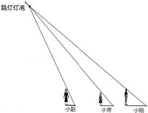 25、路灯下站着小赵,小芳,小刚三人,小芳和小刚的影长如图,确定图中路灯灯泡的位置,并画出小赵在灯光下的影子.