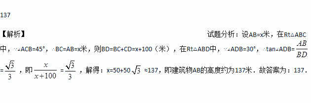 如图所示,为了测量垂直于水平地面的某建筑物AB的高度,测量人员在该建筑物附近C处,测得建筑物顶端A处的仰角为45°,随后沿直线BC向前走了100米后到达D处,在D处测得A处的仰角为30°,则建筑物AB的高度约为________米(注:不计测量人员的身高,结果按四舍五入保留整数,参考数据: