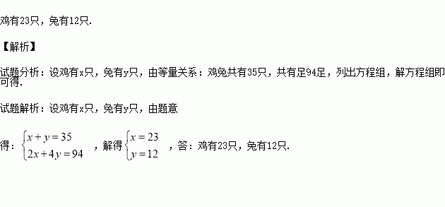 我国古代数学著作《孙子算经》中有“鸡兔同笼”问题:“今有鸡兔同笼,上有三十五头,下有九十四足.问鸡兔各几何.”其大意是:“有若干只鸡和兔关在同一笼子里,它们一共有35个头,94条腿.问笼中的鸡和兔各有多少只?”试用列方程(组)解应用题的方法求出问题的解.