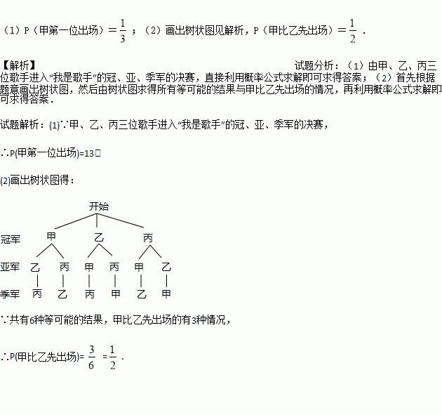 (2)求甲比乙先出场的概率.请用列表法或画树状图进行分析说明.