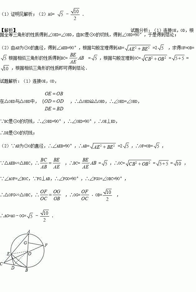 如图,△ABE是⊙O的内接三角形,AB为直径,过点B的切线与AE的延长线交于点C,D是BC的中点,连接DE,连接CO,线段CO的延长线交⊙O于F,FG⊥AB于G.