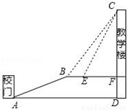 某度假村依山而建,大门A处,有一斜坡AB,长度为13米,在坡顶B处测得度假村楼CF的楼顶C的仰角∠CBF=60?,离B点8米远的E处有一花台,在E处仰望C的仰角∠CEF=73.5°,CF的延长线交校门处的水平面于D点,FD=5米.