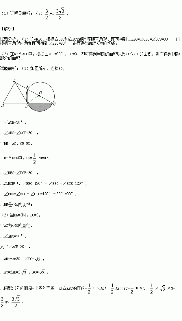 如图,AC为⊙O的直径,B为⊙O上一点,∠ACB=30°,延长CB至点D,使得CB=BD,过点D作DE⊥AC,垂足E在CA的延长线上,连接BE.