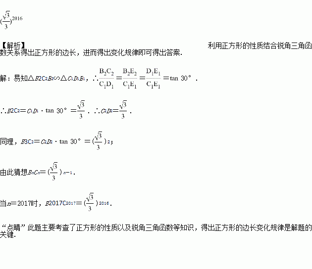 一组正方形按如图所示的方式放置,其中顶点B1在y轴上,顶点C1,E1,E2,C2,E3,E4,C3……在x轴上,已知正方形A1B1C1D1的边长为1,∠B1C1O=60°,B1C1∥B2C2∥B3C3……则正方形A2017B2017C2017D2017的边长是____;