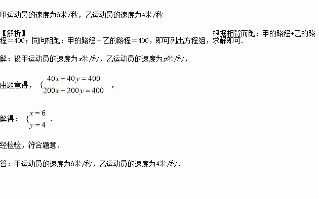 育才中学新建塑胶操场跑道一圈长400米,甲、乙两名运动员从同一点同时出发,相背而跑,40秒后首次相遇;若从同一起点同时同向而跑,200秒后甲首次追上乙,求这两名运动员的速度.