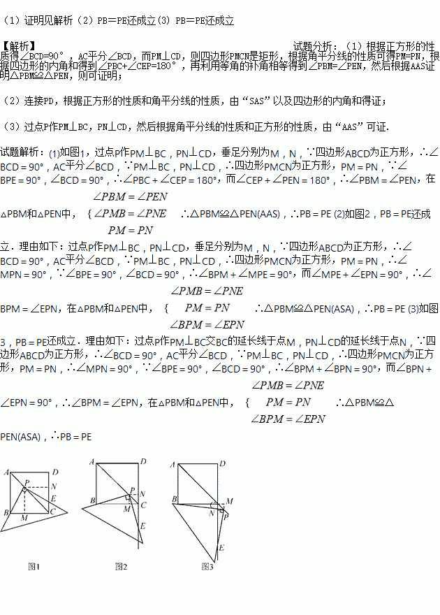 (1)Èçͼ1£¬½«Ö±½ÇÈý½Ç°åµÄÖ±½Ç¶¥µãP·ÅÔÚÕý·½ÐÎABCDµÄ¶Ô½ÇÏßACÉÏ£¬Ò»ÌõÖ±½Ç±ß¾¹ýµãB£¬ÁíÒ»ÌõÖ±½Ç±ß½»±ßDCÓÚµãE£¬Ïß¶ÎPBºÍÏß¶ÎPEÏàµÈÂð£¿ÇëÖ¤Ã÷£»
