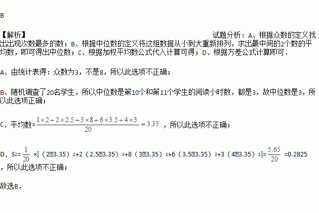 李老师为了了解学生暑期在家的阅读情况,随机调查了20名学生某一天的阅读小时数,具体情况统计如下: