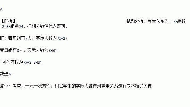 某班学生分组,若每组7人,则有2人分不到组里;若每组8人,则最后一组差4人,若设计划分x组,则可列方程为( )