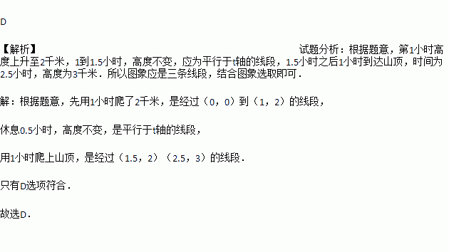 某游客为爬上3千米高的山顶看日出,先用1小时爬了2千米,休息0.5小时后,用1小时爬上山顶。游客爬山所用时间t与山高h间的函数关系用图形表示是( )