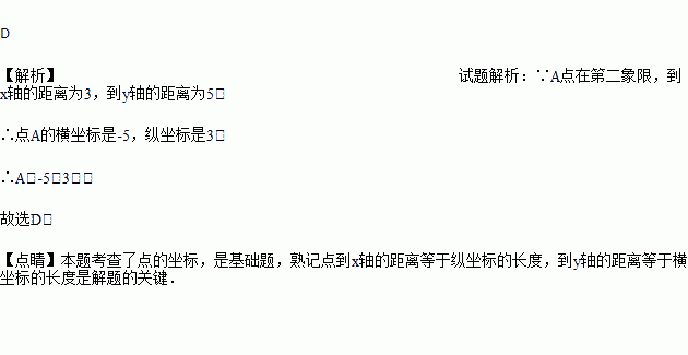 平面直角坐标系下,A点到x轴的距离为3,到y轴的距离为5,且在第二象限,则A点的坐标是( )
