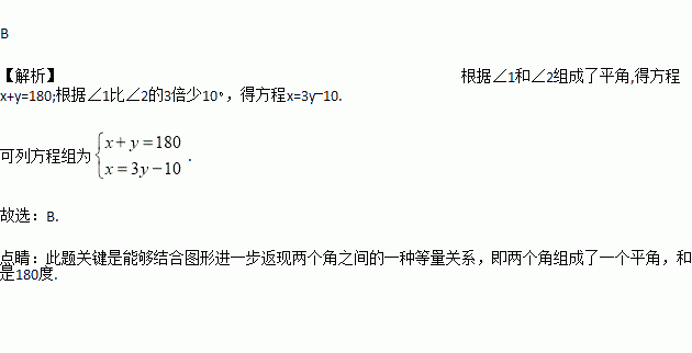 如图,点O在直线AB上,OC为射线,∠1比∠2的3倍少10°,设∠1,∠2的度数分别为x,y,那么下列求出这两个角的度数的方程组正确的是( )