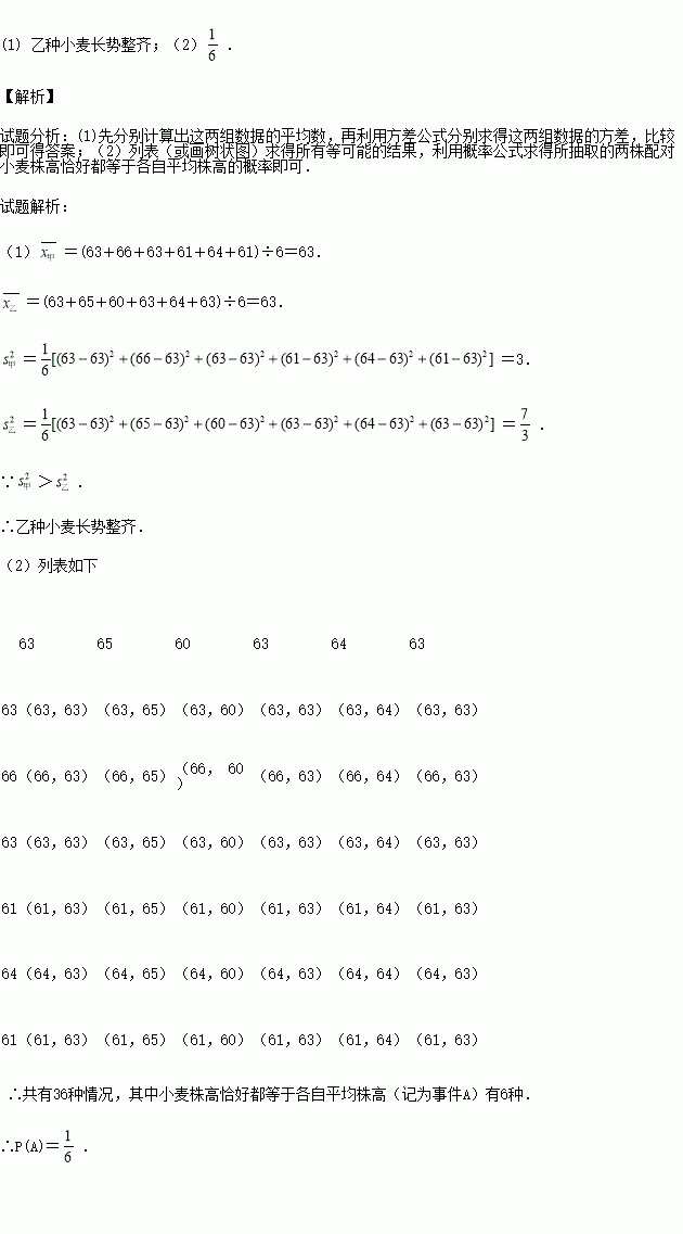 (1)请分别计算表内两组数据的方差,并借此比较哪种小麦的株高长势比较整齐?