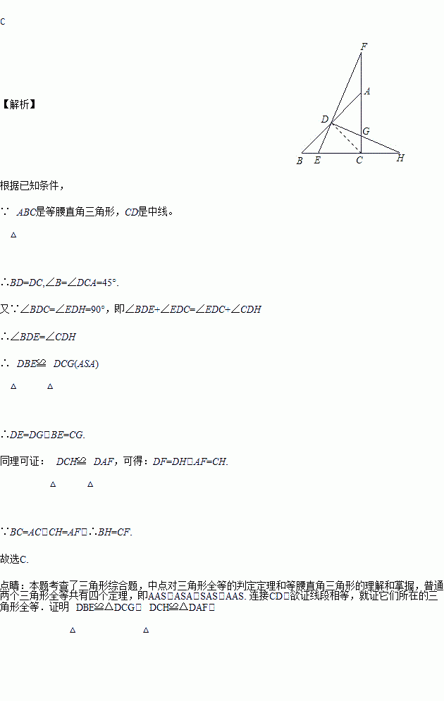 如图,D为等腰Rt△ABC的斜边AB的中点,E为BC边上一点,连结ED并延长交CA的延长线于点F,过D作DH⊥EF交AC于G,交BC的延长线于H,则以下结论:①DE=DG;②BE=AG;③DF=DH;④BH=CF.其中正确的是( )